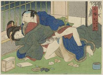 | Keywords: Jûgatsu, de tiende maand-Rijksmuseum RP-P-1995-314.jpeg  accession number RP-P-1995-314 Anonymous credit line GWToolset Rijksmuseum nl Een man in een helblauwe kimono neemt zijn gezellin van achteren De avondlucht is zichtbaar door het venster De vele papiertjes - hanagami - op de grond getuigen van herhaalde seksuele activiteit Label Line anoniem 1835 - 1845 kleurenhoutsnede Collection prenten; Japan collectie blad Height mm 98 blad Width mm 129 exhibition history paper object history Acquisition 1995 object type prent PD-US PD-old Data and photography rights All data and all images made available through the API are either in the public domain or are subject to a CC0 license https //www rijksmuseum nl/en/api/terms-and-conditions-of-use cc-zero place of creation Japan http //www rijksmuseum nl/collectie/RP-P-1995-314 http //hdl handle net/10934/RM0001 COLLECT 318793 handle Jûgatsu de tiende maand Uploaded with GWToolset Rijksmuseum RP-P-1995-314 http //www rijksmuseum nl/media/assets/RP-P-1995-314 Images uploaded by Fæ Images from the Rijksmuseum Japanese 19th-century prints in the Rijksmuseum Amsterdam |