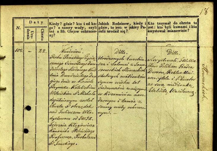 Keywords: Juliusz Słowacki birth certificate.jpg en Juliusz Słowacki birth certificate pl Akt chrztu Juliusza Słowackiego W Wilnie jedynie dopełniono obrządek chrztu Juliusza urodzonego w Krzemieńcu z Euzebiusza i Salomei z Januszewskich Na stronie internetowej litewskiego archiwum odnalazła pani Monika Janczewska parafia św Jana w Wilnie akt chrztu nr 105/1827 http //www epaveldas lt/vbspi//content/biImage jsp biRecordId 3908 imageId 2Fvbspi 2FshowImage do 3Fid 3DPG_S_30554_37 parafia św Jana w Wilnie 1827 PD-old Juliusz Słowacki Birth certificates of Poland