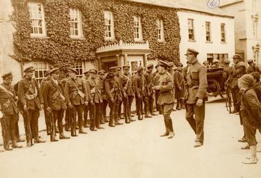 Keywords: irish civil war irishcivilwar national army nationalarmy roll call rollcall weapons children july 1922 1920s w.d. hogan wdhogan hogan collection hogancollection wednesday 26th twenties bruff limerick ireland munster national library of ireland nationallibraryofireland location identified locationidentified National Army troops lined up for a roll call during the Irish Civil War with local children casting an eye over the proceedings. This photo had been on here for almost 12 months before identification as being in Bruff, Co. Limerick by sbreathnach, to whom thanks are also due for dating confirmation: "...the advance on Kilmallock around the 25-29th of July 1922" Date: Wednesday, 26 July 1922 NLI Ref.: HOG121 National Army troops lined up for a roll call during the Irish Civil War with local children casting an eye over the proceedings. This photo had been on here for almost 12 months before identification as being in Bruff, Co. Limerick by sbreathnach, to whom thanks are also due for dating confirmation: "...the advance on Kilmallock around the 25-29th of July 1922" Date: Wednesday, 26 July 1922 NLI Ref.: HOG121 |