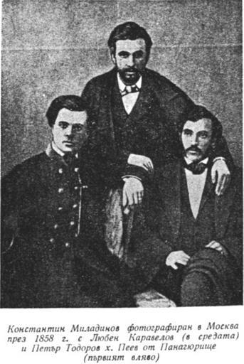 Keywords: K.miladinov.jpg en left to right Petar Hajipeev Lyuben Karavelov 1834-1879 and Konstantin Miladinov c 1830-1862 bg Константин иладинов заедно с Л Ка авелов и П Тодо ов Source Author 1858 Anonymous-EU Konstantin Miladinov Lyuben Karavelov
