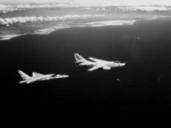 Keywords: KA-3B VAH-4 refueling RA-5C RVAH-13 c1965.jpeg A U S Navy North American RA-5C Vigilante BuNo 149278 from Reconnaissance Heavy Attack Squadron 13 RVAH-13 Bats refuels from a Douglas KA-3B Skywarrior BuNo 142653 from Heavy Attack Squadron 4 VAH-4 Fourrunners Both aircraft were assigned to Attack Carrier Air Wing 11 CVW-11 aboard the aircraft carrier USS Kitty Hawk CVA-63 for a deployment to Vietnam from 19 October 1965 to 13 June 1966 <br>The KA-3B 142653 was shot down on 12 April 1966 by Chinese Mikoyan-Gurevitch MiG-19 fighter over Luichow Peninsula in Kuangtung Province Hainan Island China after having strayed into Chinese airspace approximately 21º8 ™N 111º17 ™E The crew was killed The RA-5C 149278 was later shot down by flak over Ha Tinh Province North Vietnam on 5 May 1968 while in service with RVAH-1 CVW-9 aboard USS Enterprise CVAN-65 Both crew ejected and became prisoners of war http //collections naval aviation museum/emuwebdoncoms/pages/doncoms/Query php U S Navy National Museum of Naval Aviation photo No http //collections naval aviation museum/emuwebdoncoms/pages/doncoms/Display php irn 16002849 QueryPage 2Femuwebdoncoms 2Fpages 2Fdoncoms 2FAdvQuery php 1996 253 3579 Official U S Navy photo http //www history navy mil/our-collections/photography/numerical-list-of-images/nhhc-series/nh-series/USN-1115000/USN-1115560 html USN 1115560 from the U S Navy http //www history navy mil Naval History and Heritage Command 1965-02-20 U S Navy PD-USGov-Military-Navy Douglas KA-3B Skywarrior North American RA-5C Vigilante Aerial refueling Reconnaissance Heavy Attack Squadron 13 United States Navy |
