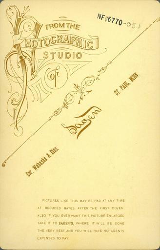 Keywords: Kabinettfotografi, Norskamerikanere, Norsk Folkemuseum NF.06770-051, bilde 2.jpg nb Kabinettfotografi av ukjent mann kortets bakside Norskamerikaner Fotografiet er kommet inn i forbindelse med Jeg fant jeg fant innsamlingen i 1962 Serien er fra norsk-amerikansk miljø Enkelte av fotografene har norskliknende navn en Cabinet card unknown male back of card Norwegian American 1890 NF NF 06770-051 kabinettfotografi-norsk-amerikanere-mann-i Sagen Minnesota St Paul USA / Norsk Folkemuseum <gallery> File Kabinettfotografi Norskamerikanere Norsk Folkemuseum NF 06770-051 bilde 1 jpg </gallery> PD-old Cabinet cards