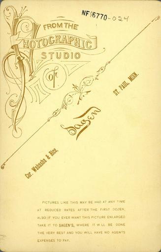 Keywords: Kabinettfotografi, Norskamerikanere, Norsk Folkemuseum NF.06770-024, bilde 2.jpg nb Kabinettfotografi av ukjent kvinne baksiden av kortet Norskamerikaner Fotografiet er kommet inn i forbindelse med Jeg fant jeg fant innsamlingen i 1962 Serien er fra norsk-amerikansk miljø Enkelte av fotografene har norskliknende navn en Cabinet card unknown female back of card Norwegian American 1890 NF NF 06770-024 kabinettfotografi-norsk-amerikanere-kvinne-i Sagen Minnesota St Paul USA / Norsk Folkemuseum <gallery> File Kabinettfotografi Norskamerikanere Norsk Folkemuseum NF 06770-024 bilde 1 jpg </gallery> PD-old Cabinet cards Norwegian Americans