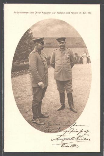 Keywords: Kaiser Wilhelm und Hindenburg in Posen.jpg Kaiser Wilhelm und Hindenburg in Posen alte Postkarte 1915-07 Bauernfreund photographiert von der Kaiserin PD-old Paul von Hindenburg 191507 Wilhelm II of Germany in 1915 191507 20th-century black and white portrait photographs of men at full length 1915 20th-century oval portrait photographs of men 1915 Black and white portrait photographs of military people in uniform Black and white portrait photographs of standing men 1915 Portraits with 2 persons |