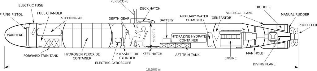 | Keywords: Kaiten torpedo type 2 schematic-1.svg en Schematic of the Japanese Kaiten Type 2 manned torpedo own Lakkasuo 2010-09-05 File TorpedoKaitenSchematics1 jpg Vectorised using Inkscape from the original JPEG format Kaiten Drawings of submarines General arrangements |