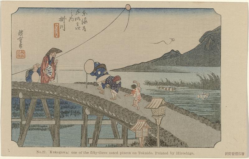 | Keywords: Kakegawa-Rijksmuseum RP-P-2010-310-95-27.jpeg accession number RP-P-2010-310-95-27 Utagawa died 1858; Fujisawa Bunjirô Fujisawa BunjirôHiroshige I credit line nl Reizigers lopen over de brug bij de Kake rivier een vlieger wordt van de overkant opgelaten Label Line mentioned on object Hiroshige I Utagawa 1797 - 1858 1906 kleurenhoutsnede; lijnblok in zwart met kleurblokken Collection prenten; Japan collectie kaart Height mm 90 kaart Width mm 141 exhibition history cardboard object history Acquisition 2009-10-13 object type PD-US PD-old Data and photography rights All data and all images made available through the API are either in the public domain or are subject to a CC0 license https //www rijksmuseum nl/en/api/terms-and-conditions-of-use cc-zero place of creation Japan http //www rijksmuseum nl/collectie/RP-P-2010-310-95-27 http //hdl handle net/10934/RM0001 COLLECT 490370 handle Kakegawa Uploaded with GWToolset Rijksmuseum RP-P-2010-310-95-27 http //www rijksmuseum nl/media/assets/RP-P-2010-310-95-27 Images uploaded by Fæ Japanese 20th-century prints in the Rijksmuseum Amsterdam Images from the Rijksmuseum |