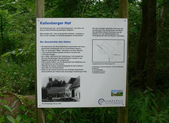 | Keywords: Kallenberger Hof Infotafel.jpg Burgruine Kallenberg Gemeinde Buchheim Landkreis Tuttlingen Informationstafel am ehemaligen Standort des žKallenberger Hofs unter der Burg own own photograph 2008-08 Photo Andreas Praefcke German Panoramafreiheit Photo Own work all rights released Public domain Burg Kallenberg Photos by User AndreasPraefcke |