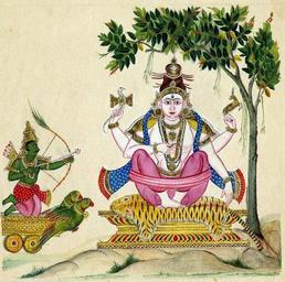 | Keywords: Kama Shiva.jpg  en Painting on paper depicting Śiva meditating Śiva sits on a tiger skin meditating beneath a banyan tree in a hilly landscape His knees are bound by a yogapatta In his upper right hand he carries a damaru in his upper hand the mriga his lower right hand carries the rudrakshamala and the lower left rests on his flexed knee The god wears the usual ornaments particularly elaborate here are his epaulettes An angavastra is draped on his shoulders and his third eye is clearly open His wife Parvati feels neglected and so she commands a diminutive green-complexioned Kama located to the right of the god who kneels on his parrot-drawn chariot while aiming his flowery arrow of love at the meditating god Angry at being disturbed Śiva opens his third eye in anticipation of destroying the hapless messanger Great care has been taken in the depiction of the sugar cane bow with its string of bees as well as in that of the lotus-tipped arrow of the god Noteworthy is the Vaishnava namam on Kama's forehead and arms The foreground is enlivened by rolling hills and tufts of grass http //www britishmuseum org/research/search_the_collection_database/search_object_details aspx objectid 3058347 partid 1 searchText Kama fromADBC ad toADBC ad numpages 10 images on orig 2fresearch 2fsearch_the_collection_database aspx currentPage 1 Author ca 1820 PD-art Shiva burns Kamadeva Parrots in art Tiger fur-skins in art |