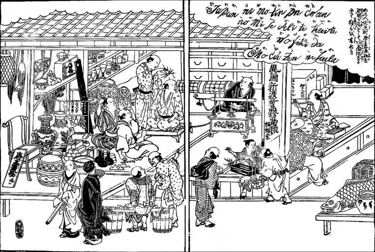 Keywords: Karamonoya.jpg ja 秋里籬島・著 丹羽桃渓・画 摂津名 図会四巻上 唐物屋 摂津名 図会 丹羽桃渓 1796~1798 PD-old/ja Art of the Edo period