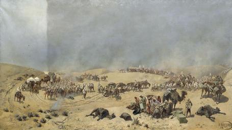 Keywords: KarazinNN HivinskiyPohodGRM.jpg Creator Nikolay Karazin Хивинский поход 1873 года Пе еход Ту кестанского от яда че ез мё твые пески к колодцам Адам-К ылган 1888 Холст масло 179х321 см Khiva campaign of 1873 Russian troops are crossing the death sands to the wells of Adam-Krylgan 1888 Oil on Canvas From http //www belygorod ru/img2/RusskieKartinki/Used/0KarazinNN_HivinskiyPohodGRM jpg PD-old-100 Central Asia Deserts War Russian conquest of Khiva Artworks missing infobox template Nikolay Karazin Military of the Russian Empire in art by Nikolay Karazin