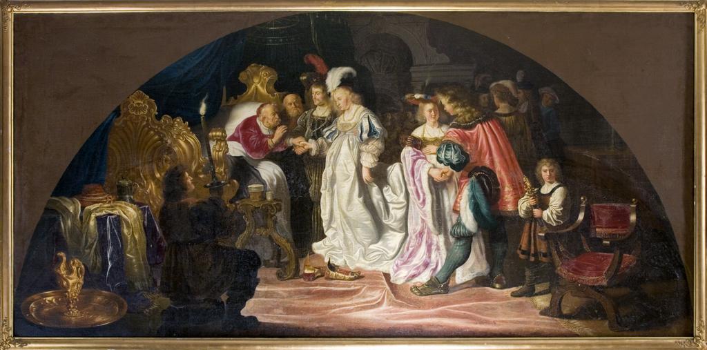 | Keywords: Kardinalen välsignar ett ungt par. Måleri. Historiebild - Skoklosters slott - 85996.tif En gammal man i karminröd dräkt och kalott liggande i praktfull barocksäng Till vänster bord med kardinalshatt handfat och kanna av guld på golvet knäböjande man som håller ljus Vid sängen står ett ungt par Kardinalen har förenat deras händer och välsignat dem Till höger ett annat par samt page som håller värja Figurerna står i ett trepassformigt fält där målningen är tjockare och färgen klarare än i hörnen möjligen påmålat och fernissat under 1600- talet <br/>Duken rektangulär målningen halvcirkelformig Resten av duken är brunmålad <br/>Kilad spännram oläsbar text skriven med blyerts Enkel förgylld prydnadsram med ornament av förgyllt bly i hörnen 1800- tal På baksidan skrivet med rödkrita No 2 Ramlistens bredd 70 mm <br/>Historiemålning sign SALOMON KONINCK F Efter teckning av Crispin de Pas i kopparstickssamlingen Köpenhamn <br/>Målningen har suttit i ett tak på Kronborgs slott i Danmark <br/><br/>The painting possibly depicts the double engagement between Duke Frederik 1471-1533 later Frederik I of Denmark and Anna of Brandenburg 1487-1514 and Kurfurst Joachim I and Elisabeth the daughter of King Hans <br/>Additonal info The painting was part of a series of paintings depicting great scenes of Danish history comissioned by Christian IV of Denmark for Kronborg Castle It was taken as war booty by Carl Gustaf Wrangel on 6 September 1658 Several of these paintings were deliberately taken by the Swedes as an act to deprive the Danes of their history Three other paintings from this series can also be viewed at Skokloster Castle today original caption Kardinalen välsignar ett ungt par Måleri Historiebild <br/> Nyckelord Målning Föremålsbild Tavla decade 1640 oil on canvas size mm 1650 3450 SKO Carl Gustaf Wrangel place of origin original filename sm_dig4013 23241 inventory number SKO 1955 85996 PD Jens Mohr Jens Mohr History paintings Media contributed by LSH unmatched objKeyword Media contributed by LSH unmatched creator Media contributed by LSH 2013-10 |