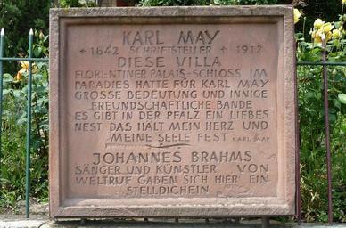 Keywords: Karl May in Deidesheim 1.jpg en Deidesheim own Immanuel Giel 2010-06 <gallery> Gedenktafel Karl May 01 jpg Gedenktafel vor der Karl May in Deidesheim 2 jpg Villa </gallery> Karl May in Ruppertsberg Plaques to Karl May Johannes Brahms in Ruppertsberg Weinstraße 82 Ruppertsberg |