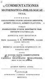 | Keywords: Karl Mollweide.png en Frontpage of Commentationes mathematico-philologicae 1813 by Carl Mollweide 1774-1825 1813 Google books https //books google cat/books id xgMGs_lh8bwC Karl Brandan Mollweide 1774-1825 other versions Custom license marker 2016 03 21 pd-old-100-1923 Covers of books about mathematics Mathematicians from Germany 1774 births 1825 deaths 1813 books |