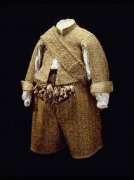 Keywords: Karl X Gustavs kröningsdräkt från 1654 - Livrustkammaren - 47402.tif LSH artwork sv Förmodligen tillverkad i Frankrike Buren av Karl X Gustav 1622-1660 i samband med kröningen <br/>I 1671 års inventarium står En Klädningh som är gjord till H K Maij tz Lÿcklige Cröningh och sägs omfatta följande plagg nämligen kappa tröja byxor knäband skorosor och handskar I 1654 års klädkammarräkning förtecknas dräkten under nr 3 på följande sätt 1 klädning och kappa av filemort gul oskuren sammet helt broderad med guld och med 140 diamantknappar till tröjan och byxorna 1 par strumpeband och skoband av rik guldbrokad helt broderade med guld 1 par underbyxor av incarnadie rosa taft och silkesstrumpor av samma färg 1 guldbroderat med guld och stofferade med guldbrokad 1 panasch plym av couleur de feu röda filemort och aurorafärgade fjädrar 1 par förgyllda sporrar och 1 värja med förgyllt fäste <br/>Nu finns endast tröjan och byxorna i behåll i sitt skick som dräkt medan den stora rundskurna kappan inte längre omtalas i inventarierna efter 1691 1704 års inv säger inget om kappan men den finns förvandlad till mässhake och altarbrun i Riddarsholmskyrkan Skänkta dit den 1 april 1705 av Riksänkedrottningen Hedvig Eleonora Mässhaken Gjord av tjock gul rips OBS Fel Enl Sveriges kyrkor skall vara sammet oskuren ett material som skiljer sig från såväl tröjans som byxornas Broderad med mönster i guld på samma sätt som på tröjan och byxorna Mönsterrapport 8 x 8 cm Såväl fram- som bakstycket består av 2 hopsydda våder av c a 40 cm bredd max längd ca 90 cm Drottningens namnchiffer HRS samt ANNO 1705 har broderats på respektive fram- och baksidorna <br/>Tröjan är sydd av vad man med ett modernt namn skulle beteckna som guldlamé som helt täckts med guldbroderi Den är av s k innocenttyp d v s ett relativt kort livplagg med planschetter inlagda som styvnad i framstyckenas snibbiga främre hörn försett med 10 små skört ståndkrage och relativt korta ärmar med öppna sömmar framtill På vänster framstycke har 17 st 2 cm knapphål sytts med jämna mellanrum ca 1 cm från kanten Vad man bör lägga märke till är att tröjan sytts av ett större antal stycken som skarvats samman Förmodligen har plagget antingen redan varit i tidigare bruk före kröningen 1654 och blivit något förtrångt eller också har man misslyckats med passformen vid tillfället i fråga och har varit tvungen att göra en del ändringar Möjligheten att tröjan kan ha förändrats vid något senare tillfälle kan man inte heller bortse ifrån <br/>Bottenmaterialet består nämligen av två skilda lamétyger ett något gulare i de smalare skarvarna och f ö ett något rödare det egentliga materialet Tröjan är huvudsakligen skuren i 2 framstycken 2 ryggstycken samt 2 ärmstycken till vardera ärmen 10 skört samt krage Man kan alltså visa att framstyckena måste skarvas med remsor av det gulare tyget utefter de raka framkanterna samt även i sidsömmen I halsringningen har en liten kil satts in mellan det vertikala skarvstycket fram och axelsömmen Bakstyckena ha fått var sin vertikala skarv knappt 4 cm bred mitt i ryggen på ömse sidor om mittsömmen Utefter ärmarnas öppna långsidor har vertikala stycken fogats till och nere vid ärmens avslutning har på undersidans stycken en smal horisontell remsa sytts På överärmstycket däremot har en horisontell skarv satts in överst uppe vid ärmringningen Kragen är också uppklippt baktill och försedd med 2 små skarvstycken Det 3 e skörtet på varje sida är eventuellt nysytt ty dess färg förefaller ljusare broderiet är klumpigare och kompositionen annorlunda mot alla de övriga 8 som exempelvis har den lilla blomman nedtill i mitten <br/>Mönstret har i någon mån missuppfattats i de senare sydda styckena så har man t ex lagt krepiner och trådar i båge i stället för att klippa av dem och börja med en ny tråd Ärmarnas nedersta parti mellan 3 5-7 cm är lämnat utan broderi beroende på att det ju skulle vikas till uppslag Ärmarna har inga knappar eller knapphål intill sprunden vid handlederna I midjan sitter på insidan under skörten 8 st små tampar med vardera 2 hål för byxornas hakar Guldlamén har en vådbredd av minst 31 cm utan stad 45x15 tr/cm2 Varje inslag består av gult silke med 2 och 2 smala trinda guldtenar på rätan <br/>Analysresultat <br/>Metalltråd tvinnad med textiltråd huvudbeståndsdelar <br/>Silver xxx<br/>Guld x<br/>Koppar xxx<br/>Zink 0<br/>Det yttäckande läggsömsbroderiet består av kantiljer av trinda tenar och platta lan av olika bredd snodder med silkeskärna omtvinnade med guldlan strängar dragna av trinda tenar av guld eller silver som stansats ut i spiraler eller öglor och manglats platta på halva sidan här benämnda spiral- eller paljett strängar i brist på befintlig terminologi och 2 och 2 tätt liggande strängar med trinda smala guldtenar virade runt ett bredare guldanklätt snöre etc Broderiet är nersytt med gult silke Mönsterraporten är 6 5x6 5 cm Mönstret Ur 2 från varandra utåtböjda palmkvistar som strax nedanför mitten sammanhålles med en uppåtböjd båge växa omväxlande 5- och 8-flikiga icke naturalistiska blommor upp <br/>Analysresultat <br/>Metalltrådsbroderi huvudbeståndsdelar <br/>Silver xxx<br/>Guld xxx<br/>Koppar xxx<br/>Zink 0<br/>Tröjan är garnerad med en 2 3 cm bred knypplad uddspets av guldtråd med 2 inlagda guldlan Mönsterrapporten är c a 2 5 cm Spetsen sitter på bägge främre ytterkanterna knapparna har alltså suttit ovanpå spetsen och fortsätter därifrån omedelbart runt de 2 främre skörten Vidare sitter det spets runt de 3 ytterkanterna av varje skört på axel-och sidsömmarna runt ärmhålen och längs de öppna ärmsömmarna sprunden Den ursprungliga knäppningen finns inte längre kvar diamantknapparna lät änkedrottningen ta ur och använda för annat ändamål Numera knäppes tröjan med hyskor o
