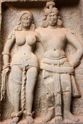 Keywords: karla caves stone carvings statues male female figures indian temple