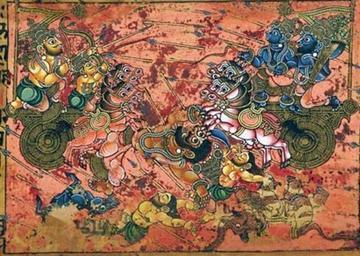 Keywords: Karna kills Ghatotkacha.jpg en This charged scene is from the Mahabharata Great Story of the Bharatas a sacred Hindu epic of ancient India that narrates the great war between two related clans the Pandavas and the Kauravas In this scene Karna mightiest warrior of the Kauravas slays Ghatotkacha the giant demon of the Pandavas On the right the blue-skinned god Krishna drives the chariot for the Pandava hero Arjuna Although the artist of this Mahabharata adopted the sharp noses and large oval eyes of the Vijayanagara court tradition his style is unique The figures which exhibit rounded contours and emphatic modeling are charged with energy http //www asia si edu/collections/singleObject cfm ObjectNumber F1975 4 Author 1670 PD-old-100 Kurukshetra War Karna Ghatotkacha |