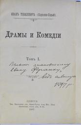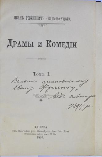 Keywords: Karpenko-Kary dramas and comedies 1953.jpg І Ка пенко-Ка ий Д ами та Комедії Одеса 1897 Титульний а куш із да чим написом авто а З особистої бібліотеки І Ф анка I Karpenko-Kary dramas and comedies Odesa 1897 Title page with dedicatory inscription From I Franko personal Library 1897 Institution Shevchenko Institute of Literature Digital Collection PD-old-70-1923 1897 book covers Franko Personal Library Collections of books in libraries in Ukraine Shevchenko Institute of Literature Uploaded with VicuñaUploader