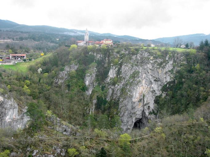 Keywords: Karst under Skocjan.jpg Village Skocjan Divača Slovenia River Reka; resurges twice from under the Karst rockformations <br> In front below View into first of 2 huge collapsed parts of cave Skocjanske jame Mala Dolina River and cave are under UNESCO World Heritage Sites protection Oben das Dorf Skocjan unten Blick in das erste Mala Dolina der beiden eingestürzten Teile der sehr großen Karsthöhle Skocjanske jame Die Felsöffnung ist der erste große Ponor von 3 durch welchen der Fluss Reka sich seinen Weg bahnt bevor er in der Höhle von Škocjan verschwindet und 38km im slovenischen Kras -Gebirge unterirrdisch fließt Die Höhle ist durch die Liste des Weltkultur- und Naturerbes der UNESCO geschützt see author 2007-03-31 Mircea_Ardelean Carst01 jpg Škocjan Divača Škocjan Caves Entrances to Škocjan Caves |