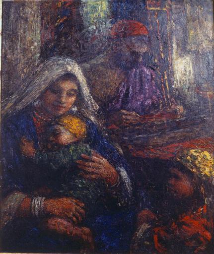 Keywords: 'Kashmir Family' by Charles W. Bartlett, c. 1935, oil on canvas.JPG Artwork creator Charles W Bartlett ca 1935 oil on canvas 30 5/8 x 24 5/8 inches Frazier Fine Art PD-old-auto 1940 Oil paintings by Charles W Bartlett Oil portraits Paintings of mothers with sleeping children Portraits of mother and child Women at work in Kashmir 20th-century oil paintings of people |