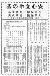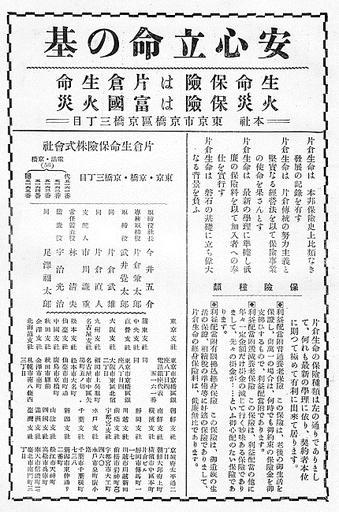 Keywords: Katakura Life Insurance Company and Fukoku Fire & Marine Insurance Company advertisement in 1930s.jpg Katakura Life Insurance Company and Fukoku Fire Marine Insurance Company advertisement in 1930s 1930年代の片 生命 険・富国火災海上 険広告 Japanese book The history of Greater Tokyo Chapter of Showa era published by Gendai-Tsushin Sha 現代 信社 大 京発達史・昭和編 より 1930s 1930年代 author Notes This file was scanned and edited by the uploader Abasaa ファイルはあばさーによりスキャンおよび編集されました PD-Japan Advertisements in Japan Insurance advertising |