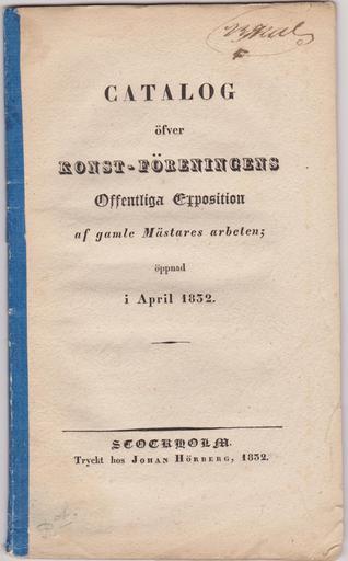| Keywords: Katalog Sveriges Allmänna Konstförenings första utställning 1832.jpg sv Titelbladet till katalogen för Sveriges Allmänna Konstförenings första utställning 1832 Katalogen är sammanställd av Axel G Bielke och har titeln Catalog öfver Konst-föreningens offentliga exposition af gamle mästares arbeten; öppnad i april 1832 1832-01-01 own Grottmannen cc-zero Uploaded with UploadWizard Art of Sweden 1832 works in Sweden Exhibition catalogue covers Title pages from Sweden | ||||