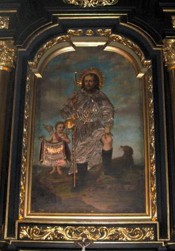| Keywords: Katedra bydgoska - obraz św Rocha.jpg pl Obraz św Rocha 1841 r w srebrnej sukience; obok niego aniołek trzymający chustę z napisem eris in peste patronus będziesz opiekunem podczas zarazy own Pit1233 2011 Cc-zero Altar of St Roch in the Bydgoszcz Cathedral |