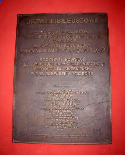 | Keywords: Katedra bydgoska - tablica drzwi jubileuszowe.jpg pl Katedra w Bydgoszczy Tablica w kruchcie kościelnej upamiętniająca drzwi jubileuszowe ufundowane z okazji 500-lecia kościoła farnego i 1000-lecia archidiecezji gnieźnieńskiej 2003 own Pit1233 2011 Cc-zero Commemorative plaques and epitaphs of Bydgoszcz Cathedral |