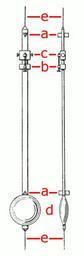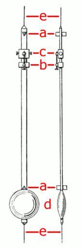 Keywords: Kater pendulum vertical.png Kater pendulum from a 1920 physics textbook Invented in 1817 by British physicist Henry Kater it was used to measure the local acceleration of gravity in geophysical surveys The labeled parts are identified in the text as a opposing knife edges on either end from which pendulum is suspended b fine adjustment weight operated by adjustment screw c coarse adjustment weight which could be moved along rod and fixed with setscrew d bob e pointers for reading Alterations to image rotated 90° CCW removed part labels and replaced with different labels in color converted from JPG to 16 color PNG Downloaded November 25 2008 from http //books google com/books id drMEAAAAMAAJ pg PA127 William Watson 1920 A Textbook of Physics 7th Ed Longman's Green Co p 127 fig 88 on Google Books William Watson 1920 Public domain Watson died in 1903 Image Kater pendulum png is a horizontal version of this image PD-old Diagrams of pendulums Gravimetry