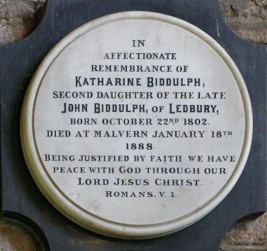 | Keywords: Katharine Biddulph.JPG en Memorial to Katharine Biddulph Born 22nd October 1802 and died in Malvern 18th January 1888 own Alf Beard 2012-03-25 This memorial is in St Michael and All Angels church Ledbury Herefordshire Uncategorized 2014 November 5 |