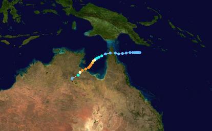 Keywords: Kathy 1984 track.png Track map of Severe Tropical Cyclone Kathy of the 1983-84 Australian region cyclone season The points show the location of the storm at 6-hour intervals The colour represents the storm's maximum sustained wind speeds as classified in the Saffir-Simpson Hurricane Scale see below and the shape of the data points represent the nature of the storm according to the legend below clear User Nilfanion/Tc/T Created by Iune using Wikipedia WikiProject Tropical cyclones/Tracks The background image is from NASA Tracking data is from the JTWC 2011-01-30 Iune 1983-84 Australian region cyclone season |