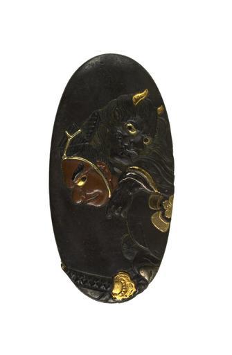 | Keywords: Katsunaga - Kashira with Ômori Hikohichi Carrying a Demon Across a Stream - Walters 511075.jpg  Ômori Hikohichi a 14th-century warrior is shown with a female demon on his back Hikohiki is said to have offered to carry a beautiful woman across a stream While crossing the stream he saw her reflection as a demon in the water In some versions of the story he kills her while in others she runs away When the story was adapted for use in theatrical dramas the woman was portrayed as the daughter of Kusunoki no Masahige who erroneously thought Hikohichi was responsible for her father's death The daughter was not actually a demon but wore a mask to frighten Hikohichi This is part of a set with Walters 51 1074 date shibuichi copper gold cm 3 3 accession number 51 1075 31942 William T / Henry Walters Collection Baltimore date and mode of acquisition unknown Walters Art Museum Henry Walters Acquired by William T or Henry Walters none place of origin Japan Walters Art Museum license Tosogu Japanese sword fittings in the Walters Art Museum Media contributed by the Walters Art Museum needs category review Katsunaga |