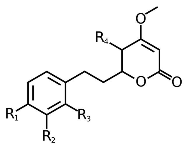 | Keywords: Kavalactone-general-4.svg en The fourth form of the kavalactone lacking double bonds between the 5th/6th and 7th/8th atoms in the chain 2011-12-28 own Benrr101 cc-zero Check categories 2011 December 29 en wikipedia Kavalactone 4 Kavalactones Uploaded with UploadWizard Monoamine oxidase inhibitors Kava |