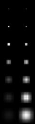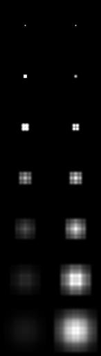 Keywords: Kawase-bloom-filter.png のブルームフィルターの核(コン リューション行列)の視覚的表現 すなわち大きさ1ピクセルの 点にフィルターをかけて得られる図 上から 状態 点) 1-path 2-path 6-path フィルタの核を表す 左図は のまま表したもので 右図は画素の 大 が 255 になるように正規化したもの kernel of the Kawase's Bloom Filter or equivalently the images obtained by applying the filter on 1-pixel-sized luminous dot From up to bottom initial state a luminous dot the kernel of 1-path filter that of 2-path filter that of 6-path filter The figure on left is the raw image and on right is the luminosity-normalized image so that the pixels have value 255 at the maximum 2016-02-08 own Rollingfrenzy other versions cc-zero Image processing |