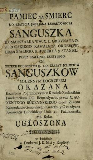 Keywords: Kazanie.png uk Титульний а куш панегі ика Янушеві Олександ у Санґушку виголошеного Авксентієм Бучинським в Бе на динському монасти і міста Заслава на Волині ад укований у Любліні 1776 оку а хів Author 1776 PD-old-100 Bernardine Monastery in Iziaslav Janusz Aleksander Sanguszko