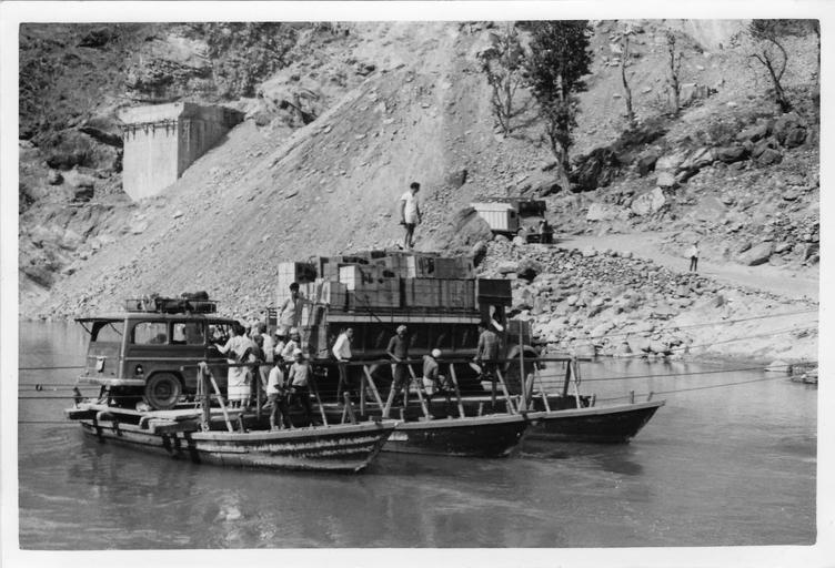 | Keywords: river crossing rivercrossing transportation nepal blackandwhite monochrome photo border outdoor black and white Date: 1970-03 Location: Palpa Description: Ferry on the Kali River near Tansen carrying a jeep and a portion of the 156 crates of equipment for the 1970 British Annapurna expedition. These crates were sent by sea from UK to Bombay and then to the Nepal border at Nautanwa and from there from Bhairahawa to Pokhara on the old road via Tansen and Butwal. Date: 1970-03 Location: Palpa Description: Ferry on the Kali River near Tansen carrying a jeep and a portion of the 156 crates of equipment for the 1970 British Annapurna expedition. These crates were sent by sea from UK to Bombay and then to the Nepal border at Nautanwa and from there from Bhairahawa to Pokhara on the old road via Tansen and Butwal. |