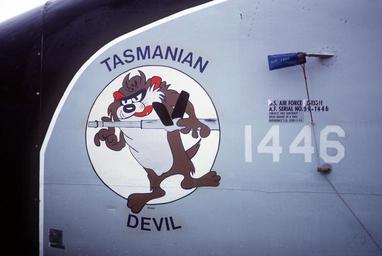 Keywords: KC-135R Tasmanian Devil Nose Art.jpeg en Nose art with the Tasmanian Devil Warner Brothers cartoon character decorates an American KC-135R Stratotanker aircraft located at Ellsworth Air Force Base South Dakota 1988 NARA-image 6448000 MSGT Jose Lopez Jr photographer PD-USGov Nose art on KC-135 Stratotanker Merrie Melodies |
