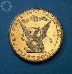 Keywords: legendary coins legendarycoins numismatics money smithsonian probably public domain probablypublicdomain circle round indoor dial ancient SI Neg. 2005-27365. Date: 9/1/2005...As early as 1850, agitation began in Congress for the establishment of a San Francisco branch of the United States Mint. This action was blocked by people from New York-who wanted a branch in their own state-and from Louisiana and Georgia-who argued that any California operation would represent unfair competition to the branch mints in New Orleans and Dahlonega..The opposition won, and San Francisco went without a branch mint for another four years. But it did get an odd sort of hybrid, the United States Assay Office of Gold, striking an odd sort of money-a gigantic-fifty-dollar ingot that also did duty as a coin. .In addition to the Assay Office, other California coiners toyed with the idea of striking fifty-dollar gold pieces. One group, headed by J. G. Kellogg and G. F. Richter went so far as to have dies for circular slugs prepared and a dozen or so proofs struck from those dies. .But by the time the project had gone forward that far, the federal branch Mint at San Francisco was finally coming into full production. Soon California private gold coinage, no matter how large or small the denominations, became irrelevant..Click here to view the reverse...Credit: Tom Mulvaney (Smithsonian Institution) SI Neg. 2005-27365. Date: 9/1/2005...As early as 1850, agitation began in Congress for the establishment of a San Francisco branch of the United States Mint. This action was blocked by people from New York-who wanted a branch in their own state-and from Louisiana and Georgia-who argued that any California operation would represent unfair competition to the branch mints in New Orleans and Dahlonega..The opposition won, and San Francisco went without a branch mint for another four years. But it did get an odd sort of hybrid, the United States Assay Office of Gold, striking an odd sort of money-a gigantic-fifty-dollar ingot that also did duty as a coin. .In addition to the Assay Office, other California coiners toyed with the idea of striking fifty-dollar gold pieces. One group, headed by J. G. Kellogg and G. F. Richter went so far as to have dies for circular slugs prepared and a dozen or so proofs struck from those dies. .But by the time the project had gone forward that far, the federal branch Mint at San Francisco was finally coming into full production. Soon California private gold coinage, no matter how large or small the denominations, became irrelevant..Click here to view the reverse...Credit: Tom Mulvaney (Smithsonian Institution) |