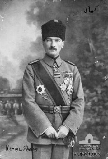 | Keywords: Kemal Pasha (c. 1919).jpg en Formal portrait of Kemal Pasha later known as Atatürk - father of the Turks wearing the Gallipoli Star and Balkan Medal Atatürk was born Mustafa Kemal at Salonika now Thessalonika Greece After graduating from the military academy in Constantinople Istanbul Kemal pursued his military career with the Turkish Army in Syria A member of the Young Turk revolutionary movement which deposed the Sultan in 1909 he took part in the war of 1911-1912 against Italy in Libya During the Second Balkan War in 1913 he became the chief of staff of the army on the Gallipoli Peninsula until posted as military attaché at the Turkish embassy in Sofia Bulgaria Kemal returned to Gallipoli in 1915 as commander of the 19th Division the main reserve of the Turkish Fifth Army and was thus on hand to oppose the ANZAC landing in April His superb grasp of strategy and ability to inspire his troops by his reckless bravery in action boosted Turkish morale and proved decisive in thwarting allied plans Given command of all Turkish forces fighting in the Anafarta sector from Chunuk Bair to Suvla Bay he was granted the title of Pasha after the August battles there After commanding in the Caucasus Kemal was at the head of Seventh Army in Palestine during the final allied offensive which defeated Turkey in 1918 The anti-Ottoman government bestowed the title of Ghazi victorious on Kemal as he had the vision to bring Turkey on par with twentieth-century western countries Turkey became a republic in 1923 and Kemal became the first president During his 15-year rule many sweeping changes were introduced to the political legal and socioeconomic fields He is an immortal hero to his people and an extraordinary leader and peacemaker Kemal said in 1933 I look to the world with an open heart full of pure feelings and friendship In 1934 he accepted the title Atatürk In 1934 Atatürk wrote a tribute to the Anzacs killed at Gallipoli Those heroes that shed their blood and lost their lives You are now lying in the soil of a friendly country Therefore rest in peace There is no difference between the Johnnies and the Mehmets to us where they lie side by side now here in this country of ours you the mothers who sent their sons from faraway countries wipe away your tears; your sons are now lying in our bosom and are in peace After having lost their lives on this land They have become our sons as well This inscription appears on the Kemal Atatürk Memorial Anzac Parade Canberra P04621 002 author c 1919 100px Mustafa Kemal Atatürk in 1919 Military fur headdress Karakul caps PD-Australia Black and white photographs Fur fashion in 1919 |