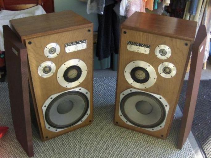 Keywords: Kenwood Model Sevens.jpg en Kenwood Model Seven Speakers own CMC1972 2009-10-09 1975 Kenwood Model Seven Speakers One of the greatest Achievements in the realm of Audio sound reproduction costing nearly 3000/pr in 1975 They were billed as Creating an exact replica of original sound Billet Aluminum Driver frames 1 inch thick crosslaid lumber core baffleboard woofer 14 25 inches crossover points 400Hz/4000Hz/8000Hz Woofer has Japanese Tech signature on backside of cone with sequence number giving testament to its quality It is believed that fewer than 30 pairs of these were ever made Woofer weighs 25 lbs by itself while each cabinet fully loaded weighs an astounding 130 lbs Kenwood Corporation Hi-Fi loudspeakers |