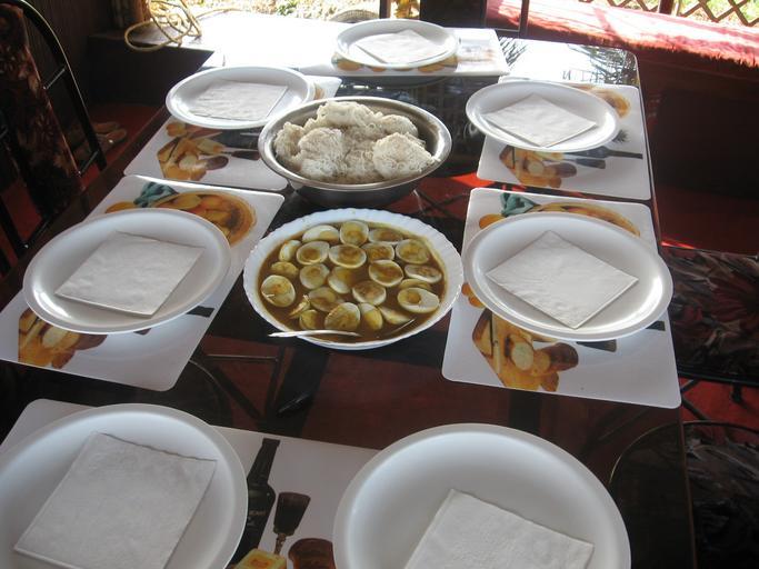 Keywords: Kerala Houseboat Breakfast.JPG Breakfast served on a Kettuvallam- Idiyappam steamed noodles made by mixing rice flour and coconut egg curry Own 2007-12-24 P K Niyogi Idiyappam Interiors of houseboats in Kerala