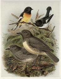 Keywords: Shows tomtits in foreground and robins on a branch above, in a bush setting Quantity: 1 colour art print(s) in book.. Physical Description: Lithograph, coloured 273 x 204 mm. Keulemans, John Gerrard, 1842-1912. Keulemans, John Gerrard, 1842-1912 :South Island tomtit, myiomoira macrocephala. North Island tomtit, myiomoira toitoi. North Island robin, miro australia. South Island robin, miro albifrons. / J. G. Keulemans delt. & lith. Judd & Co. [Plate V. 1888].. Buller, Walter Lawry (Sir) 1838-1906 :A history of the birds of New Zealand. 2d ed. London, John van Voorst, 1888.. Ref: PUBL-0012-05. Alexander Turnbull Library, Wellington, New Zealand. natlib.govt.nz/records/22884548 Shows tomtits in foreground and robins on a branch above, in a bush setting Quantity: 1 colour art print(s) in book.. Physical Description: Lithograph, coloured 273 x 204 mm. Keulemans, John Gerrard, 1842-1912. Keulemans, John Gerrard, 1842-1912 :South Island tomtit, myiomoira macrocephala. North Island tomtit, myiomoira toitoi. North Island robin, miro australia. South Island robin, miro albifrons. / J. G. Keulemans delt. & lith. Judd & Co. [Plate V. 1888].. Buller, Walter Lawry (Sir) 1838-1906 :A history of the birds of New Zealand. 2d ed. London, John van Voorst, 1888.. Ref: PUBL-0012-05. Alexander Turnbull Library, Wellington, New Zealand. natlib.govt.nz/records/22884548 |