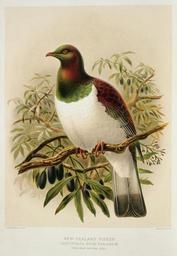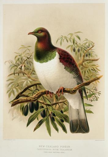 | Keywords: drawing illustration photo border Shows wood pigeon or kereru, sitting on tawa tree. Inscriptions: Inscribed - Recto - bottom right: Judd & Co. Limited, Imp.. Quantity: 1 colour art print(s) in book.. Physical Description: Lithograph, coloured  274 x 206 mm.    Keulemans, John Gerrard, 1842-1912. Keulemans, John Gerrard 1842-1912 :New Zealand pigeon. Carpophaga Novae Zealandiae. (one-half natural size). / J. G. Keulemans delt. & lith. [Plate XXIV. 1888].. Buller, Walter Lawry (Sir) 1838-1906 :A history of the birds of New Zealand. 2d ed. London, John van Voorst, 1888.. Ref: PUBL-0012-24. Alexander Turnbull Library, Wellington, New Zealand. natlib.govt.nz/records/22326260 Shows wood pigeon or kereru, sitting on tawa tree. Inscriptions: Inscribed - Recto - bottom right: Judd & Co. Limited, Imp.. Quantity: 1 colour art print(s) in book.. Physical Description: Lithograph, coloured  274 x 206 mm.    Keulemans, John Gerrard, 1842-1912. Keulemans, John Gerrard 1842-1912 :New Zealand pigeon. Carpophaga Novae Zealandiae. (one-half natural size). / J. G. Keulemans delt. & lith. [Plate XXIV. 1888].. Buller, Walter Lawry (Sir) 1838-1906 :A history of the birds of New Zealand. 2d ed. London, John van Voorst, 1888.. Ref: PUBL-0012-24. Alexander Turnbull Library, Wellington, New Zealand. natlib.govt.nz/records/22326260 |