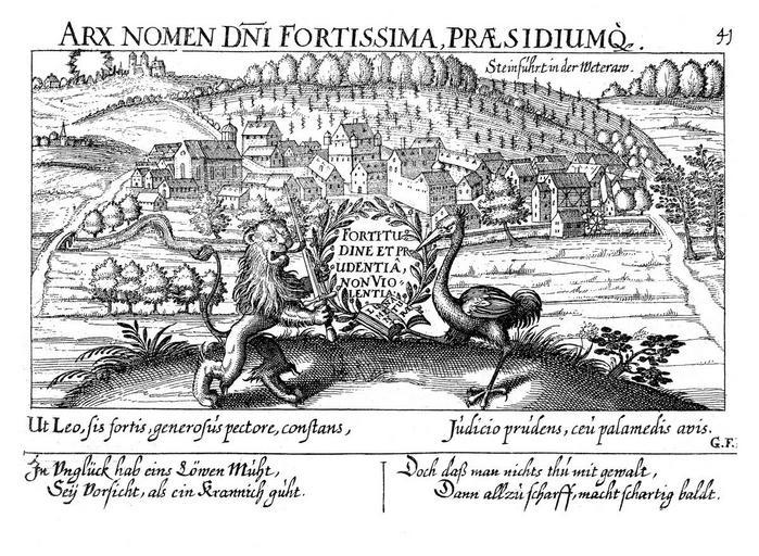 Keywords: Kieser Steinfurth 1624.jpg de Daniel Meisner/ Eberhard Kieser Thesaurus Philopoliticus oder Politisches Schatzkästlein Bd 1 Faksimile-Neudruck der Ausgabe Frankfurt/ Main 1625-1626 u 1627-1631 Nördlingen 1992 Buch 3 Nr 40 http //www lagis-hessen de/de/subjects/idrec/sn/oa/id/3260 creator Eberhard Kieser 1624 Bad Nauheim Thesaurus Philopoliticus Löw ™sches Schloss Steinfurth PD-old-100 |