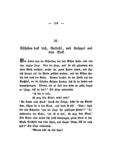 Keywords: Kinder und Hausmärchen (Grimm) 1837 V1 214.jpg 213 215 The Wishing-Table the Gold-Ass and the Cudgel in the Sack