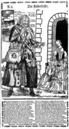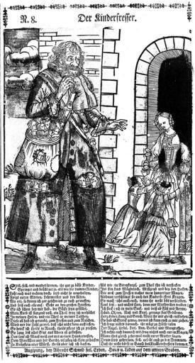 Keywords: Kinderfresser 3.jpg Augsburg at Albrecht Schmid seel Erben Augsburg http //edocs ub uni-frankfurt de/volltexte/2007/7736/ author ~ 1750 wikitable collapsible collapsed Transliteration - <poem>N 8 Der Kinderfreſſer Still ſtill und werdet fromm ihr gar zu böſe Kinder Springet und brüllt nit ſo als wie die dumme Rinder Laßt euch was wehren doch fext nicht ſo ungehalten Folgt euren Elteren Lehrmeiſtern und den Alten Wo nit ſo komm ich gar geſchwind zu euch gelauffen Und friß euch alle auf Seht an den großen Hauffen So ich ſchon bey mir hab die Säcke ſeyn gefüllet Mein Korb iſt ſtarzend voll ein Theil in meinen Taſchen Dieſe all hab ich geraubt zum Freſſen und zum Naſchen Wird mir die Zahl zu viel daß ichs nicht kann auffreſſen So henck ich theils in Rauch theils pflege ich zu preſſen So lang bis alles Blut aus Adern iſt gefloſſen Das ſauf ich Maaß weiß aus mit meinen Hausgenoſſen Dem WauWau und der Bercht vil pfleg ich klein zu hacken Zu Knöpflein oder Würſt theils aber laß ich backen Als wie ein Birenknopf zum Theil thu ich verſtecken Ins stinkend Mägdeloch Miſtgrub und bey den Hecken Bi smich zum Freſſen mahnt mein hungeriger Magen Alsdann verſchlingt ſie auch des Kinderfreſſers Kragen So mache ichs auch euch wann ihr wollt bös verbleiben Faul seyn und nicht thun denn nur Muthwillen treiben ; Ich ſteck euch in mein Sack und beiß ab Füß und Aerme Händ Ohren Naß und Kopf zernage das Gedärme Herz Leber Lung und Bauch Wolt ihr mir gleich entfliehen So hab ich Strick genug womit ich kann euch zu mir ziehen Ich frage nichts darnach ihr mögt zu Hülfe rufen Der Regel Urſul Lies Ann Berbel und Margrethen Ich nehm euch dannoch mit frag nichts nach eurem Klagen Wann ihrs gleich zehenmal wollt eurer Mutter ſageb Drum ſeyd gehorſam ſtill geſellt euch zu den Frommen Daß ihr nicht dörft in Bauch des Kindleinfreſſers kommen Augſpurg bey Albrecht Schmid ſeel Erben Hauß u Laden auf dem untern Graben </poem> PD-old Ogre Blood libel Human cannibalism in art |