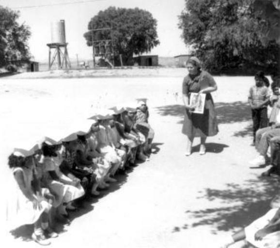 | Keywords: arizona mennoniteboardofmissions voluntaryservice ruby brenneman rubybrenneman bible school bibleschool blackandwhite monochrome outdoor black and white Caption: Kindergarten graduates repeating Bible verses at graduation excerises. Ruby Brenneman, Mennonite volunteer from Wellman, Iowa, is the teacher. Stanfield, Arizona. 1962. Citation: Mennonite Board of Missions Photograph Collection. Mission to Arizona, 1950-1970. IV-10-7.2 Box 1 Folder 54 , photo #31. Mennonite Church USA Archives - Goshen. Goshen, Indiana. Caption: Kindergarten graduates repeating Bible verses at graduation excerises. Ruby Brenneman, Mennonite volunteer from Wellman, Iowa, is the teacher. Stanfield, Arizona. 1962. Citation: Mennonite Board of Missions Photograph Collection. Mission to Arizona, 1950-1970. IV-10-7.2 Box 1 Folder 54 , photo #31. Mennonite Church USA Archives - Goshen. Goshen, Indiana. |