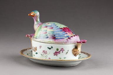 Keywords: Kinesisk porslinskarott i form av and, från 1735-1795 - Hallwylska museet - 95872.tif LSH artwork sv TERRIN Med lock och fat; möjligen senare än Qianlong Karotten oval med rak profil plan botten samt på ändarna med utåtböjda flikiga handtag med vulstiga fästen Lock kupigt i form av en liggande and med huvudet vänt åt vänstra sidan; sarg låg Fat ovalt med nästan plan botten kälformig kep samt snett utstående rakt brätte Karott Med dekor av lotusblommor fiskar och andra blommor och vattenväxter Fat På insidan i botten en mandarinand färger som locket däromkring dekor som på karotten Glasyren med s k orangeskalsyta karottens bräddkant och lockets sarg oglaserade karotten och fatet på bottens utsida oglaserade original caption Kinesisk porslinskarott i form av and från 1735-1795 <br/> Nyckelord Fågel Fåglar Qianlong decade other date - 1750 1760 HWY place of origin CN original filename hm_dig12477 14819 inventory number HWY XLVIII X A e g 01 95872 CC-BY-SA Jens Mohr Qianlong Emperor Birds in art Chinese ceramics in the Hallwyl Museum Sweden Jens Mohr Media contributed by LSH 2014-11 |