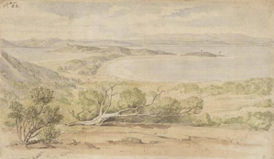 | Keywords: King George's Sound, View from Peak Head.jpg King George's Sound View from Peak Head a 15 7 x 27cm pencil-and-wash 1801 field sketch by William Westall It depicts King George Sound on the south coast of Western Australia Specifically it is a view looking north-north-west from Peak Head across Torndirrup and Vancouver Peninsula towards the mainland The shrubs in the foreground are probably Anthocercis viscosa left and Banksia verticillata centre This field sketch was the basis for Westall's 1809 “1812 oil-on-canvas painting Part of King George III Sound on the South Coast of New Holland December 1801 which was later engraved as View from the south side of King George's Sound http //nla gov au/nla pic-an4561301 1801 William Westall PD-old-100 <gallery> File King George's Sound view from Peak Head schematic svg Schematic diagram of the field sketch identifying geographic features File Part of King George III Sound on the South Coast of New Holland December 1801 jpg Part of King George III Sound on the South Coast of New Holland December 1801 the oil-on-canvas painting based on this field sketch File View from the south side of King George's Sound jpg The engraving View from the south side of King George's Sound </gallery> William Westall King George Sound Banksia verticillata Anthocercis viscosa |
