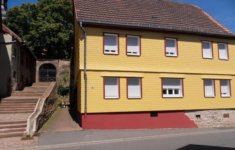 Keywords: KirchbrombachHauptstr30.JPG de Denkmalgeschütztes Fachwerkhaus mit verschindelter Fassade in der Hauptstraße 30 in Kirchbrombach mit der zum Kirchhof führenden Treppenanlage 10950 own Brühl 2010-07-08 Kirchbrombach Wooden shingle sidings in Germany Cultural heritage monuments in Brombachtal |