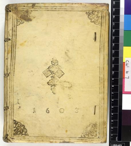 Keywords: Kirchen-Ordnung der Graffschafft Erpach - Upper cover (c41b7).jpg Style Centrepiece made of small tools Cornerpiece Dated; Caption Upper cover; Colour White / cream; Edge Unspecified exhibition history Decorative Technique Tooled in alloy frequently gold and silver zwisch; Cover Material Parchment May be tooled in silver or in gold which has oxidised Traces of 2 pairs of ties Dated 1603 Headband core laced through outside covers object history Text 1602; Frankfurt; Unspecified object type Cc-zero place of creation Binding Germany place of discovery Unspecified British Library image http //www bl uk/catalogues/bookbindings/LargeImage aspx RecordId 020-000008458 ImageId ImageId 43834 Copyright BL Kirchen-Ordnung der Graffschafft Erpach Uploaded with GWToolset Kirchen-Ordnung der Graffschafft Erpach - Upper cover c41b7 http //www webarchive org uk/bldatasets/bindings/9079_4 jpg Bookbinding 17th-century bookbinding British Library Bookbindings |